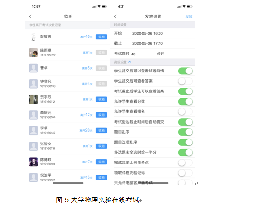 如何有效评价线上教学效果是每门课程最终都要面对的问题。信息技术可以让我们既能关注“过程”又能顾及“结果”。大学物理实验教学团队利用超星学习通平台将视频观看、章节测验、平时成绩、教学交互等各类活动逐一记录,有效关注学生的学习过程并精确到个人。此外,团队老师也能通过平台对学生进行线上考核,而题库的建成,让教师拥有更多考核手段,如发布作业,随堂测验,设置阶段性在线考试,其中在线考试模式则可以实现随机出题、题目乱序、选项乱序、监考等功能,极大促进了学生的自主学习,进一步丰富了平时成绩考核。