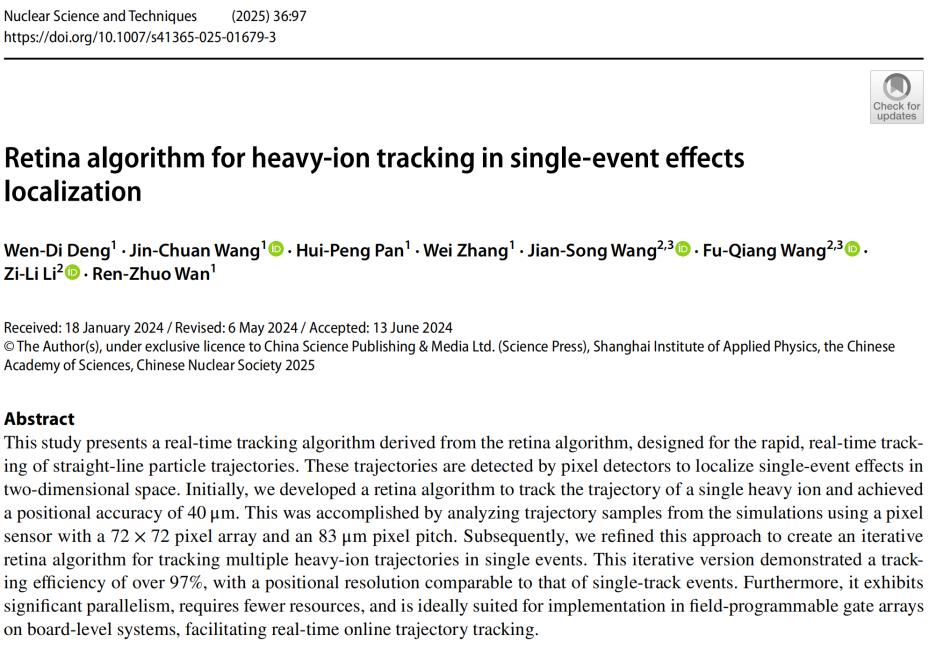 近日,我校威廉希尔WilliamHill官方网站万仁卓教授团队邓文迪博士在国际著名核科学与核探测技术期刊Nuclear Science and Techniques(中科院一区Top)上发表了题为“Retina algorithm for heavy-ion tracking in single-event effects localization”的高水平研究论文。该研究工作设计提出一种基于视网膜算法的在线重离子径迹触发与参数重建算法,并在此基础上研制一套非接触式的单粒子效应定位监测系统。该算法利用视网膜算法进行模式识别,利用FPGA器件高并行与延时可控的特点,为重离子束流检测以及单粒子效应定位提供新的方法与思路。该论文的第一作者为邓文迪博士,武汉纺织大学万仁卓教授与湖州师范学院李自立博士为本论文的共同通讯作者,武汉纺织大学为第一通讯单位。