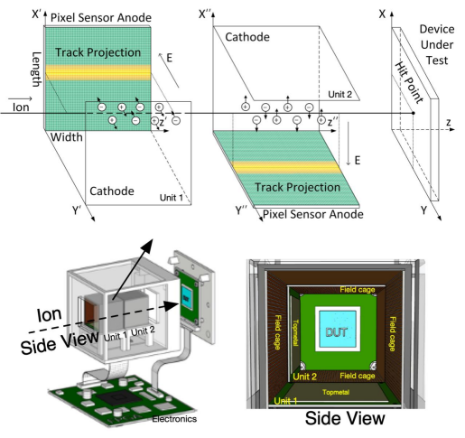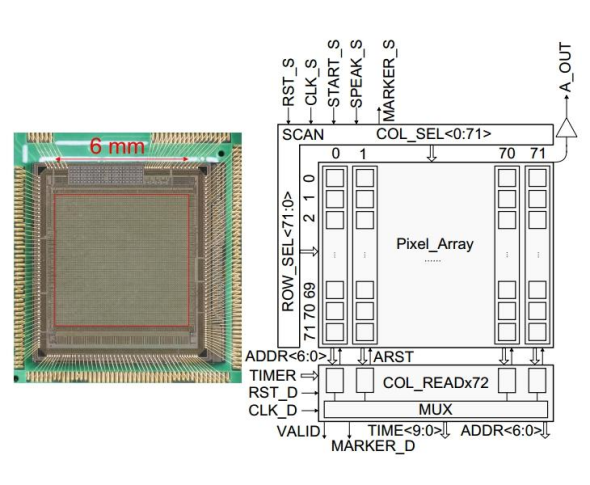截至目前算法已经完成了原型验证,并适配用于基于二维像素探测芯片Topmetal芯片对重离子直线轨迹的快速循迹研究,实现三维空间中辐射单粒子效应(SEE)快速定位。上图左侧为基于Topmetal芯片搭建的SEE效应定位装置原型机结构示意图。两个搭载同型号Topmetal芯片的感应区域被安置在待测芯片(DUT)正前方,在物理空间上呈90度放置。当分别加入垂直于Topmetal芯片的均匀电场后,该装置可以在X-Z以及Y-Z方向对射向待测芯片的重离子轨迹进行捕获,基于视网膜算法的循迹算法对重离子的轨迹参数进行重建,从而完成SEE效应定位。上图右侧为单个Topmetal芯片结构,单个像素尺寸为83um*83um,像素阵列规模为72*72,整个芯片有效探测面积为6mm*6mm.