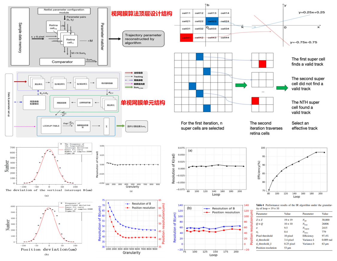 算法结构、算法原理和研究结果分别如上图左上/右上以及下方所示。算法结构上我们在单个FPGA芯片内部采用阵列分布式放置N*M个视网膜计算单元,实现粒度最大为N*M的视网膜扫描计算,每个视网膜单元是独立的并行的计算,保证算法的速度与实时性。单个视网膜计算单元内部则根据坐标参数进行常规的样本权重值计算。最终通过找极大值的方式定位到目标视网膜单元从而重建出对应重离子轨迹参数。测试结果表明在粒度为100*100时算法位置分辨率达到18.11 微米,小于Topmeta传感器上单像素面积大小的四分之一。FPGA处理一组径迹样本的触发延迟为3.98微秒至5.98微秒,平均5.18微秒,满足在线重离子径迹触发的实时性要求。