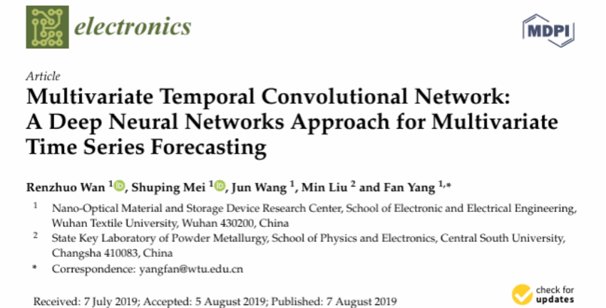 根据Essential Science Indicators(简称ESI)最新数据显示,我校威廉希尔WilliamHill官方网站万仁卓教授团队发表在国际学术期刊《Electronics》上的研究论文《Multivariate Temporal Convolutional Network: A Deep Neural Networks Approach for Multivariate Time Series Forecasting》(Electronics 2019, 8(8), 876)成功入选工程学科领域ESI全球前1%高被引论文。论文第一作者为万仁卓教授,通讯作者为杨帆副教授,武汉纺织大学为第一通讯单位。