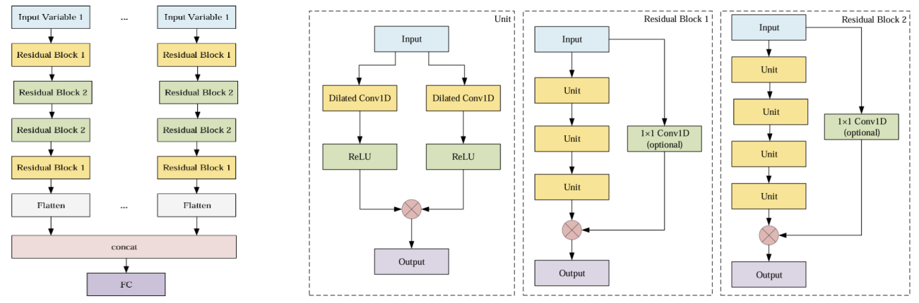 M-TCN 模型将多变量时间序列预测构建为非周期数据集的序列到序列场景。模型采用 1D 卷积而非因果卷积,避免了因果卷积受时间序列绝对顺序限制的问题,更高效地学习数据特征。同时,模型运用空洞卷积算法,在不丢失序列信息的情况下扩大感知视野,适应长信息依赖问题。此外,M-TCN 创新性地引入两种不同的非对称残差块,构建了多头模型,每个输入变量都有单独的子模型,学习不同特征信息,最后组合子模型输出进行预测(图1)。