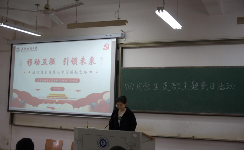 “大国来电”特色党课中,电子学生党支部徐仁杰带领大家学习《关于在全党大兴调查研究的工作方案》,并分享了自己的感悟;光电通信学生党支部李明玉以“移动通信 引领未来”为题,从“通信基础不断完善 技术革新突飞猛进”“网民规模快速增长 网络大国崛起东方”“通信红利惠及全民 互联网经济迸发活力”三个部分介绍了我国通信业如何从一穷二白发展成如今的信息通信大国,实现从1G空白到5G领跑的跨越,看到了党的领导下我国的高速发展。