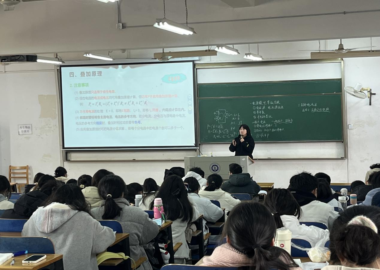 本次公开课主要围绕叠加定理的定义展开讲解。课堂伊始,汤老师首先通过一个与现实生活紧密相关的问题引入主题,迅速吸引学生注意力,激发学习兴趣。随后通过具体的电路图示,结合实际生活中的电器设备,帮助学生更好地理解抽象的电工理论,让学生在探索中加深对叠加定理的理解。