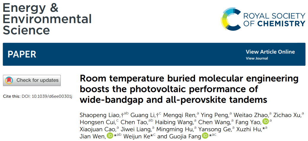 近日,我校威廉希尔WilliamHill官方网站先进能源与未来显示技术团队胡绪志博士等人在国际著名期刊《Energy and Environmental Science》上在线发表了题为“Room Temperature Buried Molecular Engineering Boosts the Photovoltaic Performance of Wide-Bandgap and All-Perovskite Tandems”(埋底界面室温分子工程提升宽带隙及全钙钛矿叠层太阳能电池光伏性能)的研究成果。武汉纺织大学为第一单位,湖北师范大学及武汉大学为合作单位,联合培养研究生聊少鹏与武汉大学研究生李广为论文的共同第一作者,胡绪志博士、温建博士、柯维俊教授和方国家教授为论文的共同通讯作者。