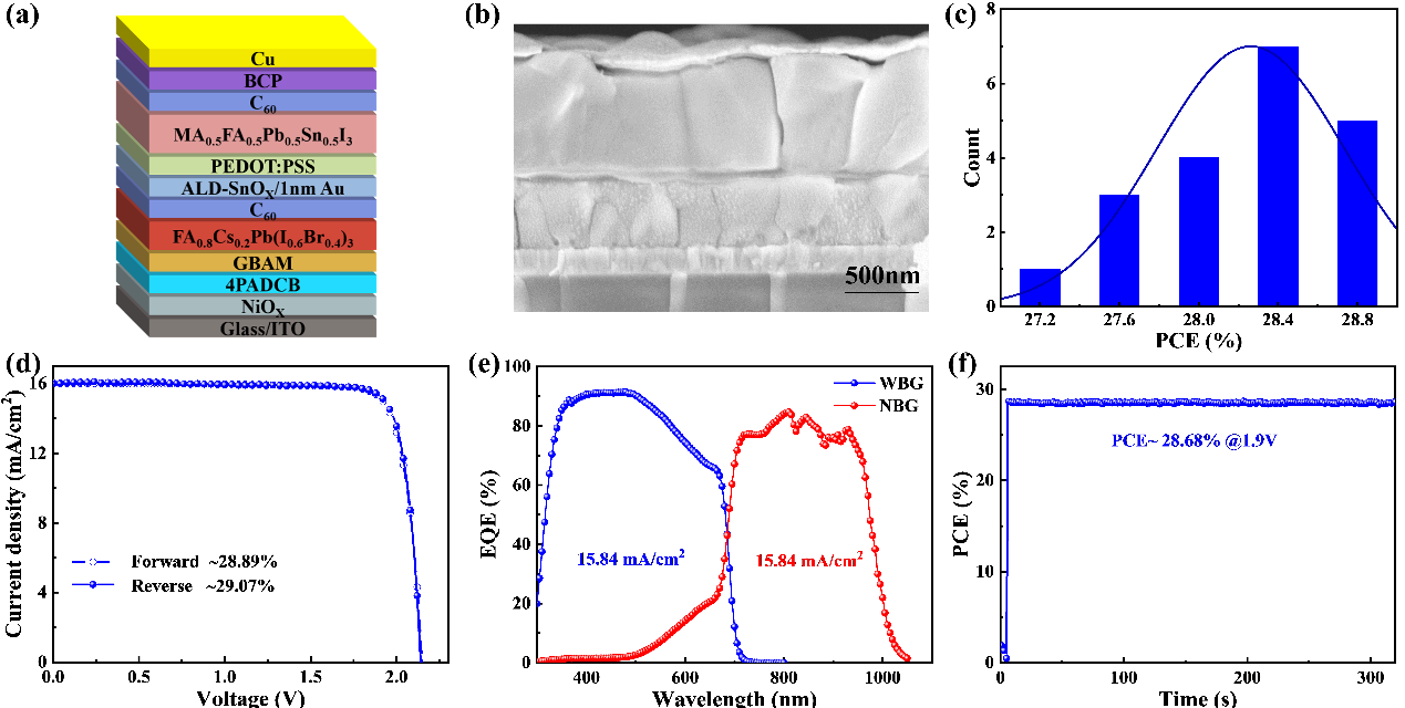 通过采用这种室温湿膜法,研究人员开发了一种带隙为1.78 eV的p-i-n结构宽带隙钙钛矿太阳能电池,实现了20.9%的光电转换效率;以此单结宽带隙钙钛矿太阳能电池为基础,成功制备了两端全钙钛矿叠层太阳能电池,实现了29.1%的光电转换效率。