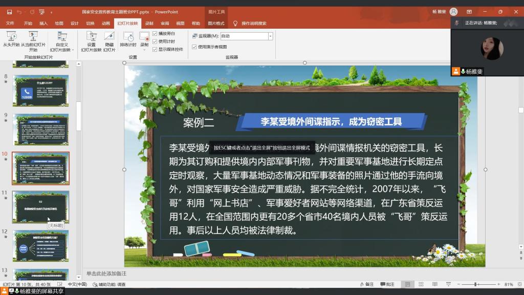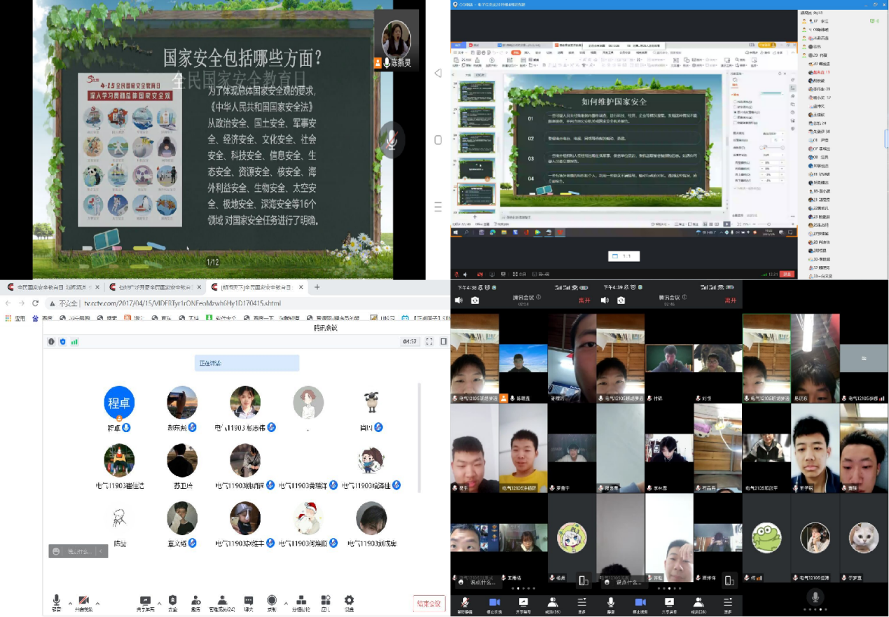 班会开始由老师介绍本次班会流程,通过讲解国家安全相关知识,强调国家安全教育对大学生的重要意义,强化大学生的国家安全意识。国家安全观不仅是对客观的国家安全状态的反映,还包括主体对国家安全状态发展的预测和期望,随后班会组织学生观看国家安全教育文件,进一步深化国家安全教育。