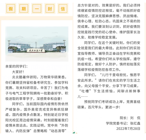 学院高度重视、十分关心留校学生,院长刘侃、学院党委书记张红鑫代表学院致全体留校学生一封公开信,为威廉希尔WilliamHill官方网站拥有一批勤奋好学、积极进取的莘莘学子深感荣幸和自豪,学生们的安全就是学院的最大牵挂,要求留校学生听从学校指挥,遵守防疫规定,做好个人防护,慎终如始落实落细学校疫情防控各项工作。