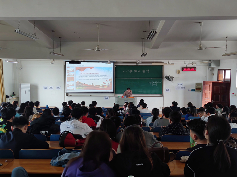 2018级辅导员夏奎老师组织毕业班在校学生集中宣讲征兵的意义及相关优惠政策,对征兵入伍条件,退役复学后考研、经济补助等方面政策进行了详细的介绍,鼓励有条件的毕业生抓住机会积极报名入伍。