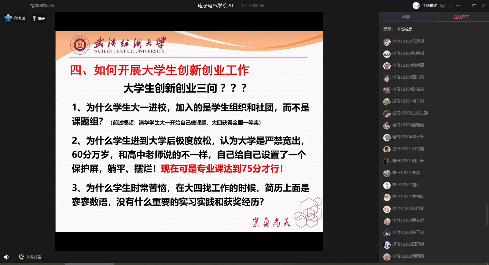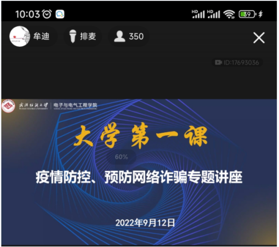 9月12日上午,辅导员牟迪在QQ群课堂开展了“疫情防控、预防网络诈骗专题讲座”。牟迪首先介绍了近期的疫情形势,并带领学生学习《武汉纺织大学学生疫情防控违纪违规处分暂行办法》。随后传达了学校疫情防控要求,提醒学生增强防护意识,遵守学校疫情防控规定。最后对电信网络诈骗进行了讲解,提高学生防范意识,增强防范能力。