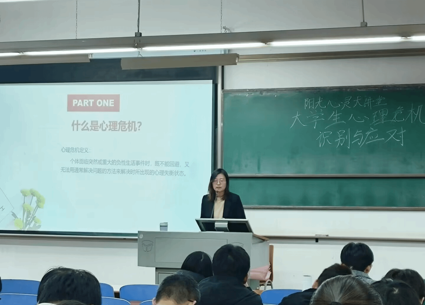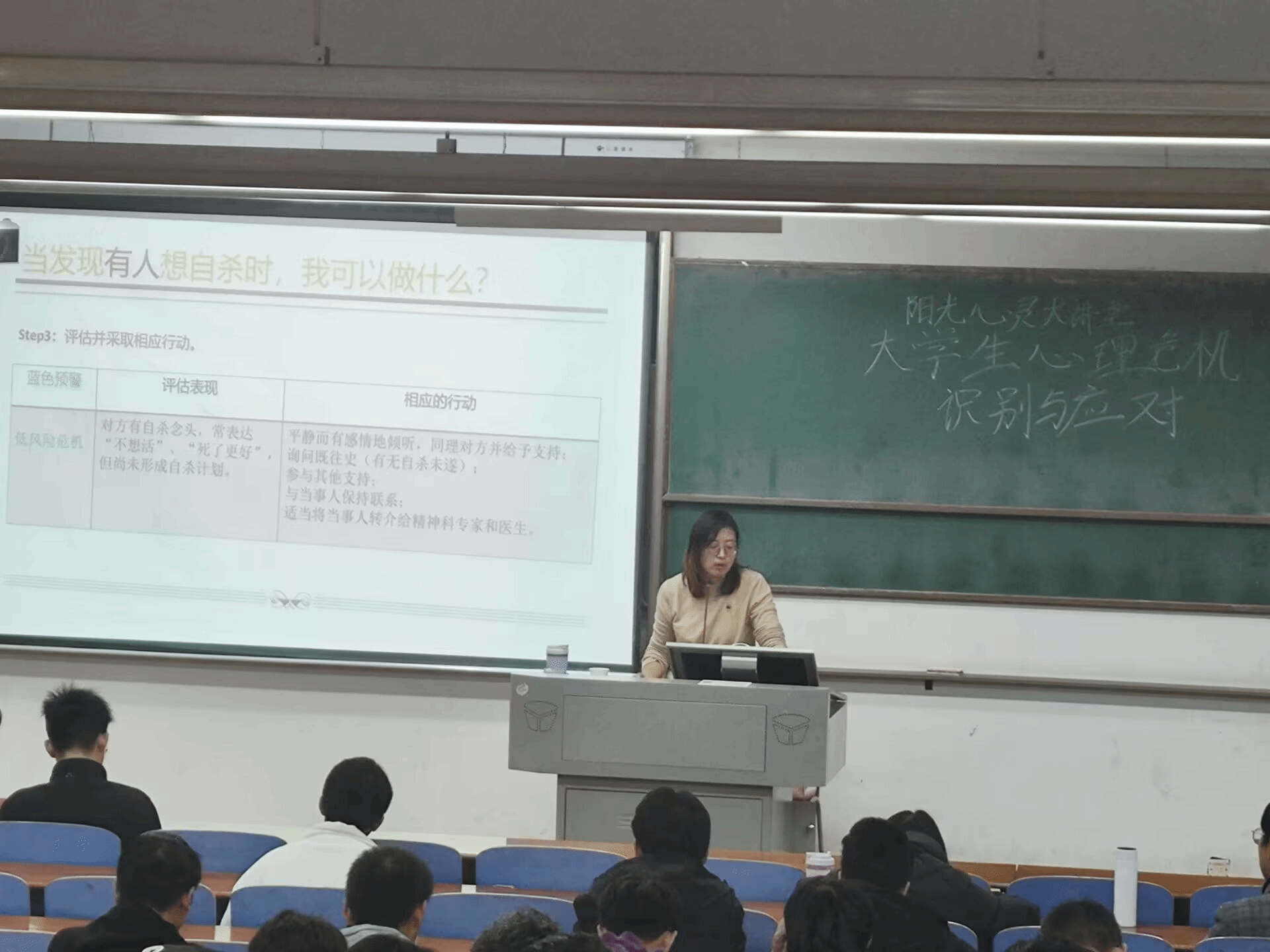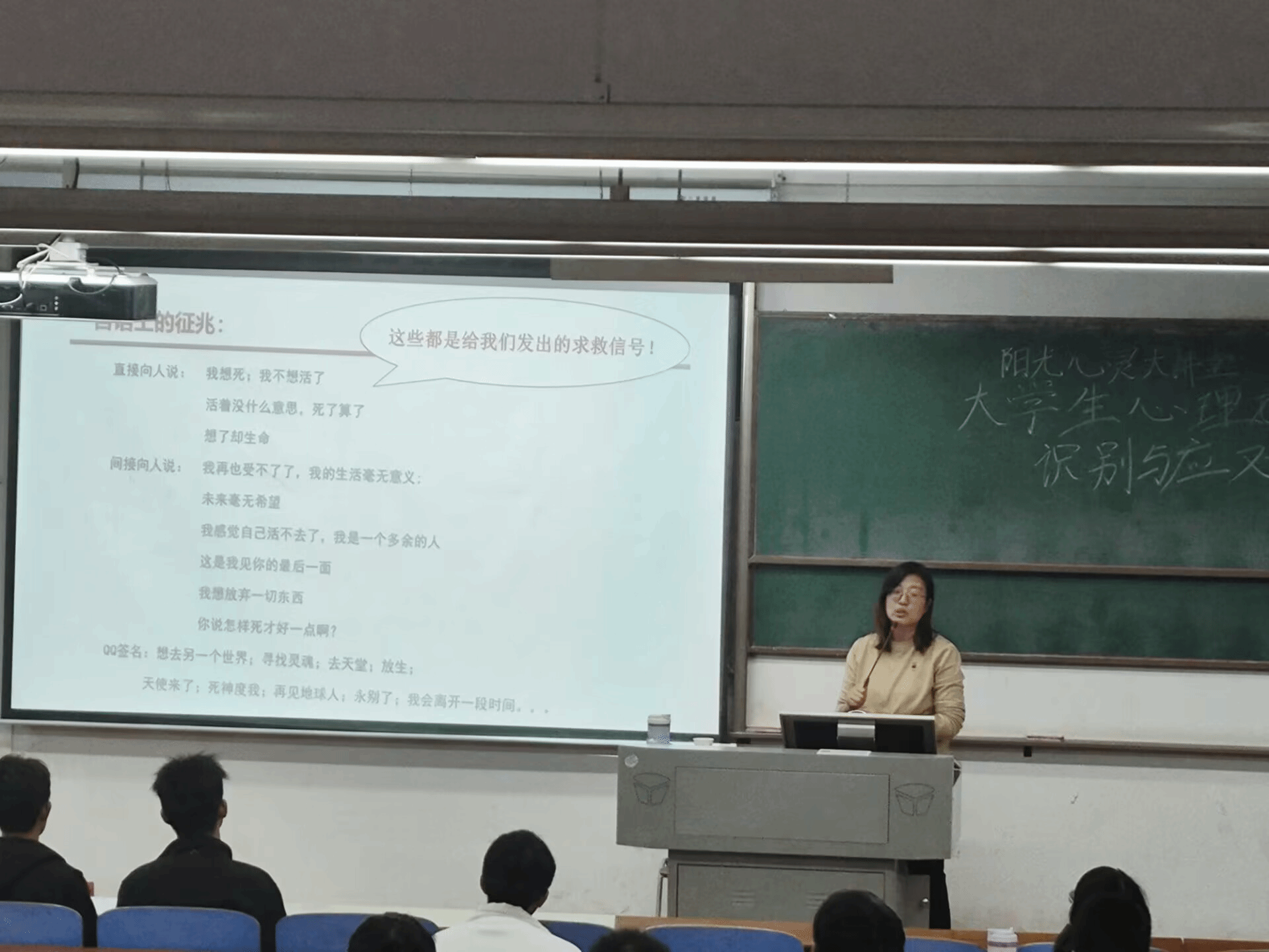 崔老师在讲堂中通过语言和行为两方面向学生科普了常见心理疾病和精神疾病的症状及其辨别方式,并且给出了精神类疾病发病时学生进行临时陪护的方法。在对需要提前预警的重点人群进行介绍之后,崔老师介绍了与处于心理危机状况的学生进行交谈的语音技巧,以及相处时需要做到的尊重与理解,并强调脱离危机状态后需要进行持续关注。