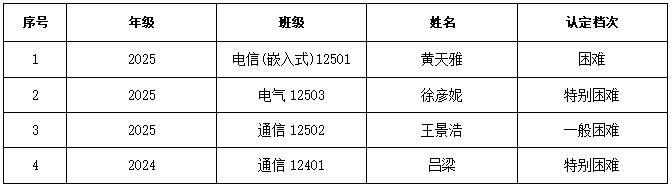 根据《关于做好2025-2026学年家庭经济困难学生认定及家庭经济困难学生信息库建设的通知》、《武汉纺织大学家庭经济困难学生认定工作实施细则》(武纺大学〔2020〕2号)文件要求,经本人申请、班级民主评议、学院初审,现对家庭经济困难本科生认定结果予以公示:
