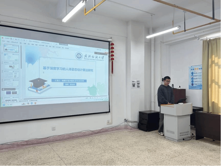 胡浩冉同学汇报的题目是“基于无监督学习的织物表面异常检测算法研究”。她通过对比有监督学习和无监督学习,说明在异常检测中引入无监督学习的重要意义,并重点讲述了改进自动编码器和CycleGAN模型的训练阶段,提出利用图像重构的思想来实现异常检测。祁宇欣同学汇报的题目是“基于深度学习的目标识别与定位-YoloV8目标检测”。他介绍了Yolo V8模型及其组成模块,讲述了深度学习模型对遮挡目标识别与定位的原理研究,重点分析了深度模型对目标识别定位的实现。
