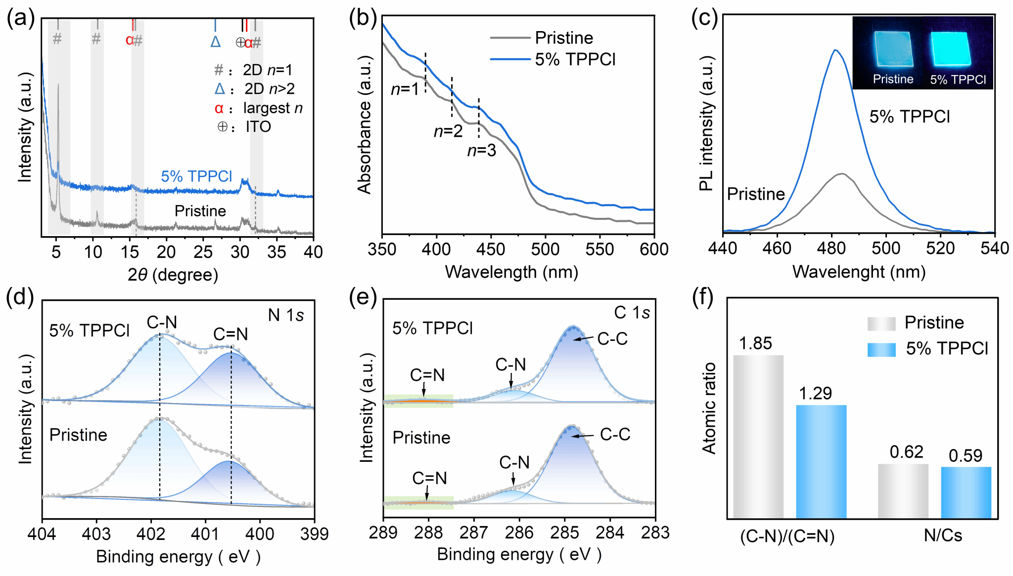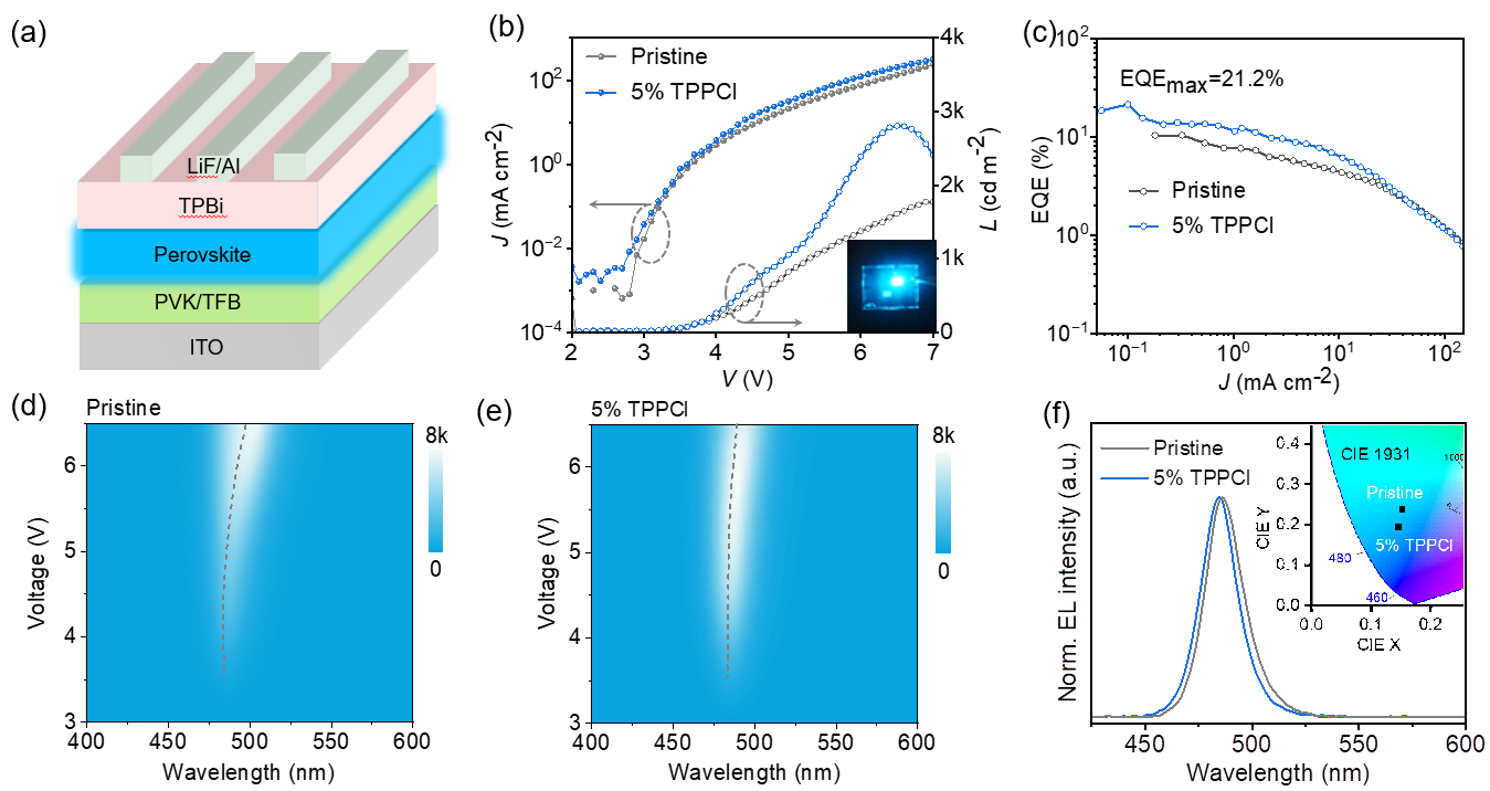 针对上述问题,团队提出了基于四苯基氯化膦(TPPCl)的添加剂工程,构建准二维混合卤化物钙钛矿蓝光LEDs。TPPCl通过氢键作用调控PEA⁺结晶动力学,抑制低n相非辐射复合;其芳环与钙钛矿中铅离子的相互作用可同步调制电子态密度。双机制协同优化低带隙高发光准二维相分布,使薄膜光致发光量子产率(PLQY)显著提高,最终实现了发光波长在485 nm附近、外量子效率(EQE)达21.2%的高性能稳定蓝光发射。