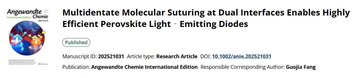近日,我校威廉希尔WilliamHill官方网站先进能源与未来显示技术团队曹晓娟博士、姚方副教授等人在国际著名期刊《Angewandte Chemie International Edition》上在线发表了题为“Multidentate Molecular Suturing at Dual Interfaces Enables Highly Efficient Perovskite Light-Emitting Diodes”(多齿分子双界面缝合策略实现高效钙钛矿发光二极管)的研究成果(https://doi.org/10.1002/anie.202521031)。武汉纺织大学为第一单位,武汉大学及华中农业大学为合作单位,曹晓娟博士及联合培养研究生王璇为论文的共同第一作者,方国家教授、雷红伟副教授、姚方副教授为论文的共同通讯作者。