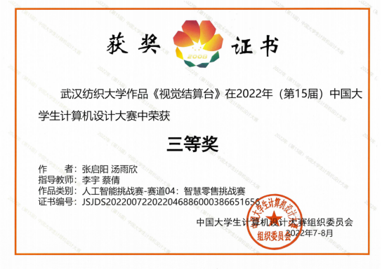 中国大学生计算机设计大赛是2022年教育部认可的56项全国普通高校大学生竞赛排行榜的榜单赛事,参赛对象是中国大陆高校当年在籍的本科生(含当年毕业的本科生、来华留学本科生)。本届赛事从2022年1月启动,全国分六大赛区(济南决赛区、沈阳决赛区、厦门决赛区、上海决赛区、南京决赛区、杭州决赛区),全国900多所院校10万余件作品参赛。在人工智能挑战赛赛道智慧零售挑战赛中,由威廉希尔WilliamHill官方网站2020级研究生王雪松同学任领队,2018级本科生张启阳、汤雨欣两位同学组成的参赛队,历经校级初赛、省级复赛激烈PK,最终进入国赛复赛。复赛全程5天,威廉希尔WilliamHill官方网站参赛队经过作品初评、实物测试、远程答辩、专家质询等环节最终取得了优异成绩。
