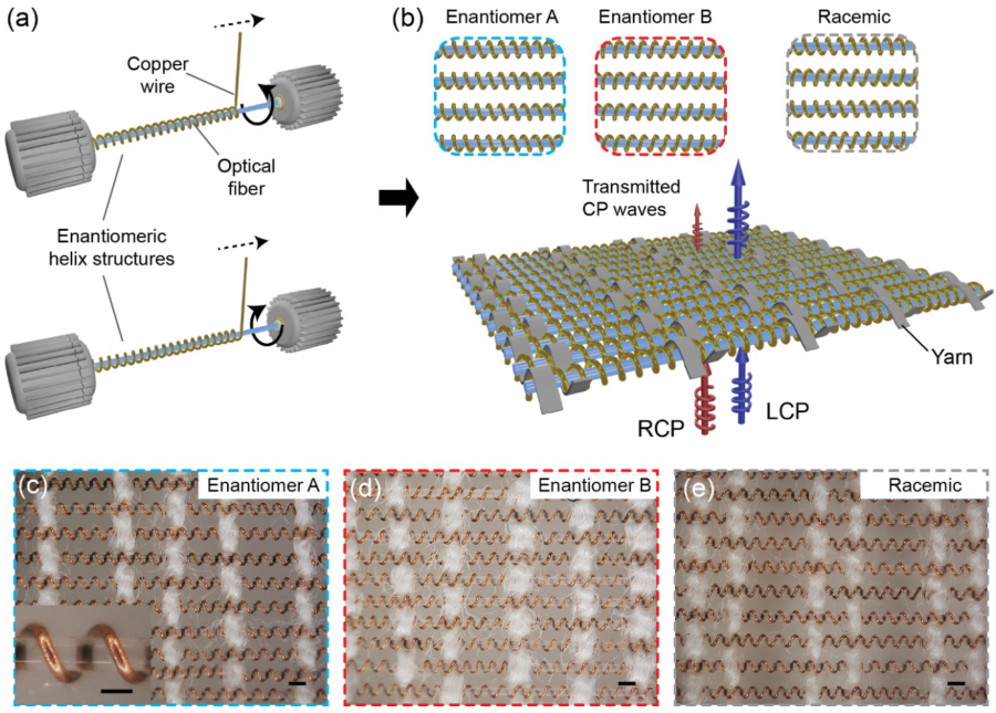 研究团队提出了一种新型复合编织式太赫兹手性光电子器件。首先,用绕线机将金属铜丝(直径约为60微米)沿剥离外包层的裸光纤(直径约为140微米)绕制,形成具有微米级螺距的螺旋结构作为构成人工超构材料的基本单元结构。该螺旋结构同时作为后续纺织工艺的纬线。进而,利用传统纺织技术以涤纶线为经线将制备好的人工单元结构纬线编织成超构材料样品。在本项工作中,利用两步纺织制造方法实现了大面积具有微米特征尺寸的超构材料样品制备,并且制备出的器件在太赫兹波段表现出强手性选择性和显著光学活性。