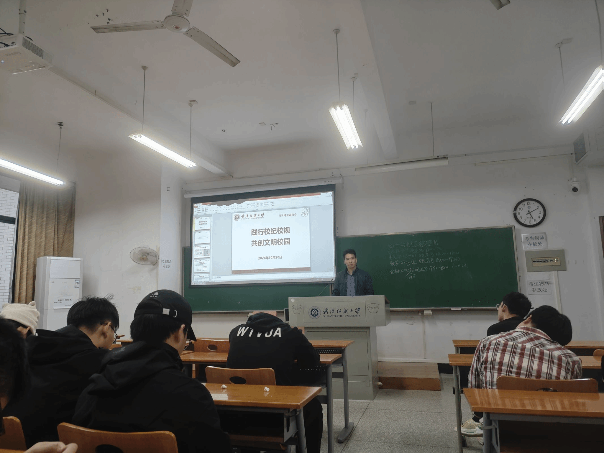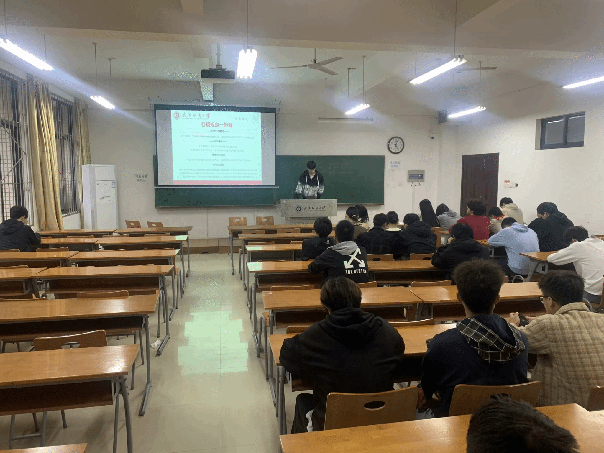 会议伊始,老师向同学们阐述了为何要遵守规矩。古人言“不以规矩,不能成方圆。”良好的行为规范,是校园生活的指南针,指引同学们明辨是非,规范言行;是人际交往的润滑剂,促进我们相互尊重,和谐共处;是成长路上的灯塔,照亮我们前行方向,助力梦醒启航。作为一名合格的大学生,一定要做到心中有规矩,行为定方圆。同学们要争做良好校风学风建设的践行者、宣传者和监督者,用自己的实际行动点亮新时代的青春底色。