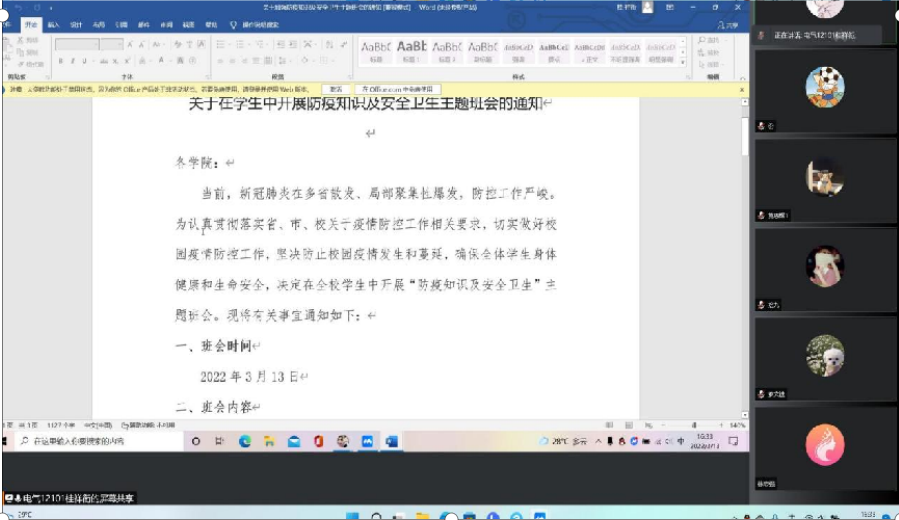 为降低疫情传播风险,确保在校师生安全,落实疫情防控措施,威廉希尔WilliamHill官方网站于3月13日召开疫情防控主题班会,班会由各班班主任和辅导员主持进行,全体学生参加会议。
